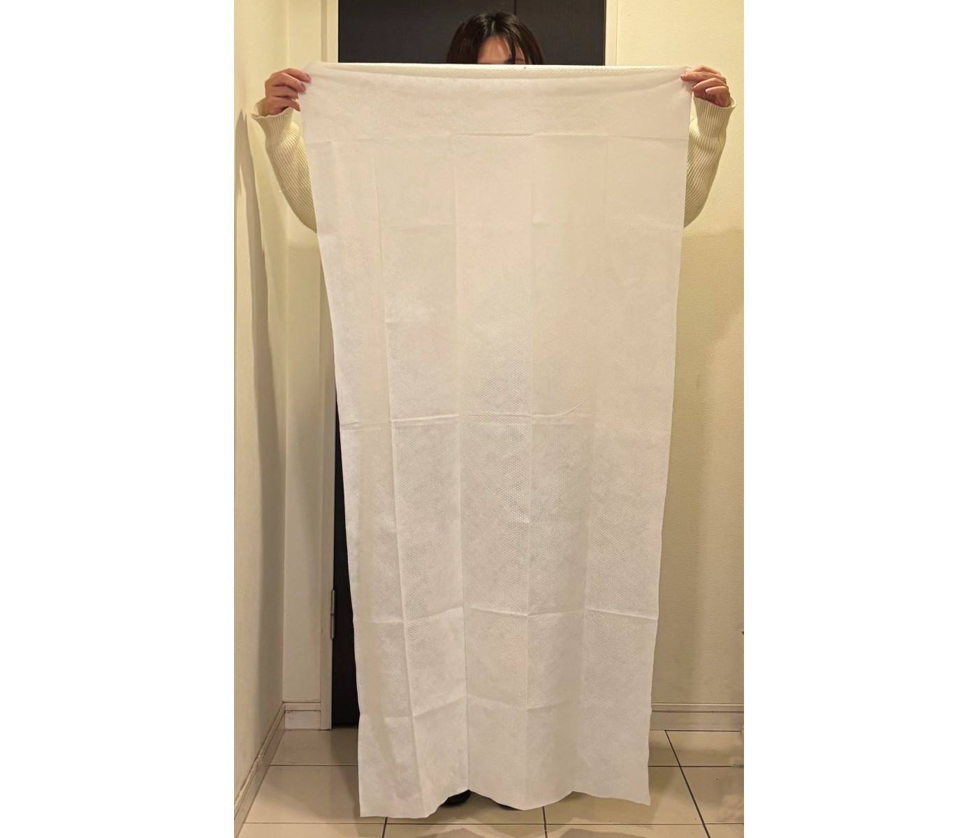 商品紹介に「大判サイズでいろいろな用途に使用できて便利」とありますが、このサイズならシングル用の布団シーツとしても使えるかも。もちろん、不要になれば小さくして外で捨てることもできますよ!