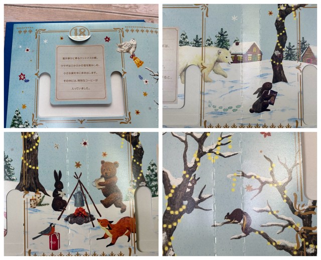 ドリップコーヒーの袋を取ると出てきたのは、クリスマスにまつわるお話。1日ずつ読み進めていくと、1冊の絵本のような可愛らしい物語ができあがります!