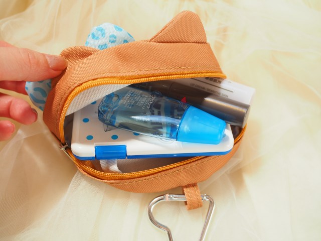 中にはリップ2本に目薬、ミントケースも余裕で入りました◎ ほかにもイヤホンケースやお菓子などのかさばるものを入れるのもいいかも。お出かけのお供にちょうどいいサイズですよー!