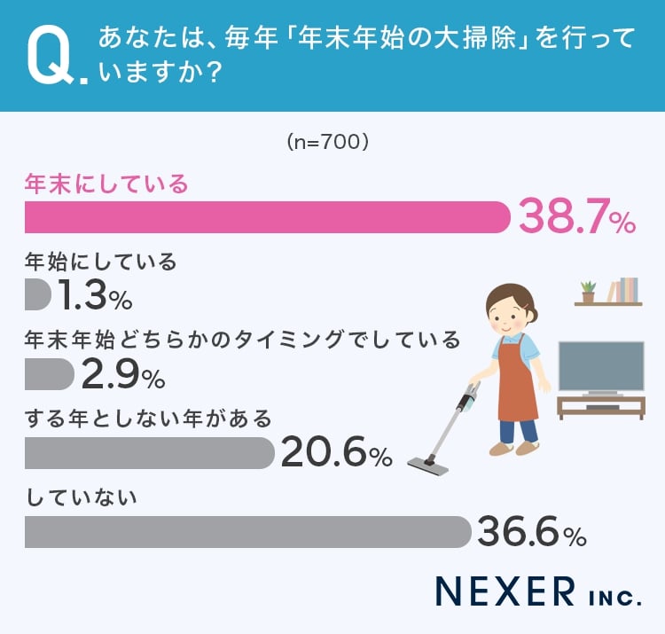 全国の男女700名を対象に、株式会社NEXERとエコゼストがおこなった調査によると、「年末に大掃除をしている」と回答した人は38.7%。いっぽう「年末年始には大掃除をしない」と回答した人は36.6%でした。数字だけ見ると、ほぼ同じくらいじゃんッ!
