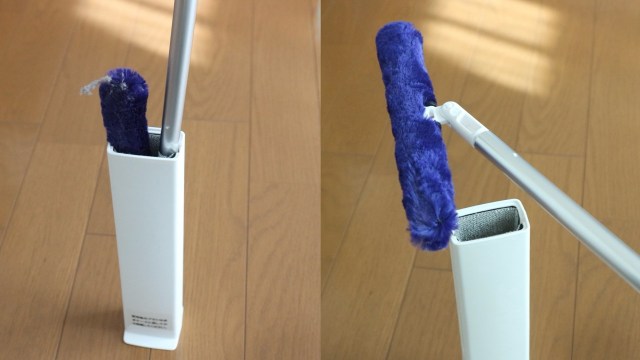 モップに溜まったホコリはどうするかというと、これがまた便利で、ケースの中にはクリーニングスポンジが仕込まれています。使い終わったモップをケースに通して、何度かスッスッと抜き差しすると……。