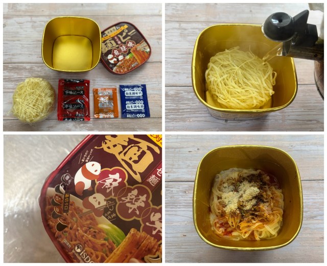 パッケージは同シリーズのマーラータンと同じ、ボックス型のカップ。カップにめんを入れ、熱湯を内側の線まで注ぎ、フタをして3分待ったら、湯切り口からお湯を捨て、辛味ソース・粉末調味料・調味酢を入れてよく混ぜればできあがりです!