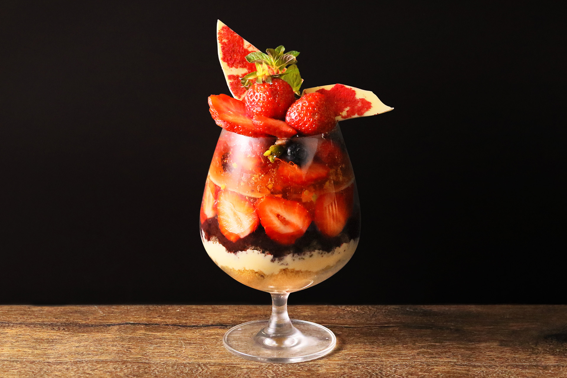 ディナータイム限定で登場する、あまおうを1ダース=12粒使用(!)した夢のようなパフェ。溢れんばかりのいちご、いちご×フロマージュのアイス、いちごクランチ、ロゼワインのジュレを加えています。ぜひワインと一緒にいただいちゃって。