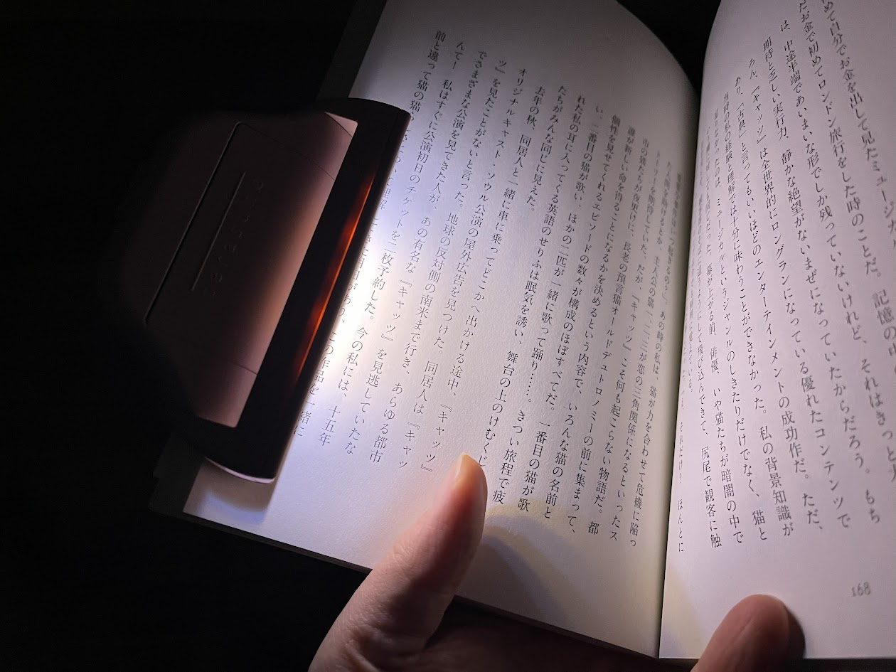 このライト、小さいながらもかなり優秀。真っ暗な空間でも手元だけ明るいし、ハードカバーでも文庫サイズでも、ページ全体にまんべんなく光をあててくれます。細かく角度調整できるので「ここが見えづらい」といった場所にあてることも◎。