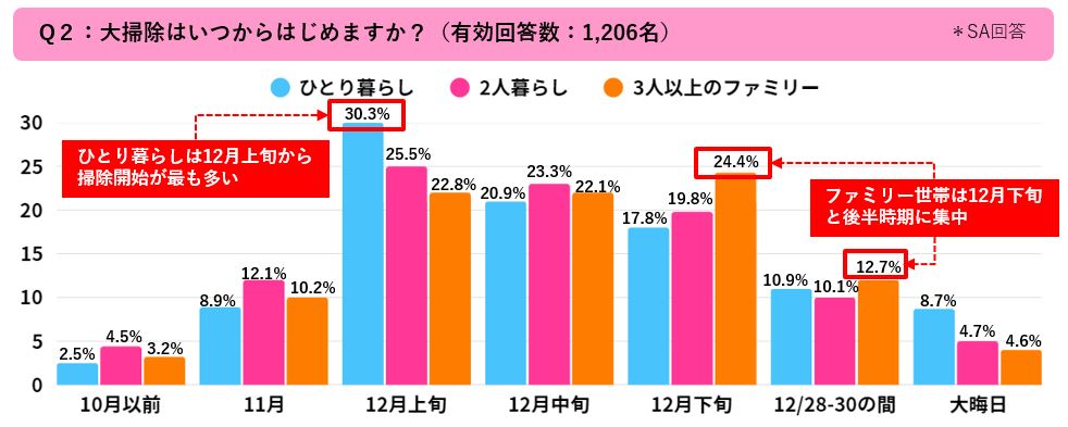 大掃除の開始時期は世帯によってバラバラで、ファミリー世帯では「12月下旬〜大晦日3日前」が多かったいっぽう、ひとり暮らしは「12月上旬」がいちばん多いッ!