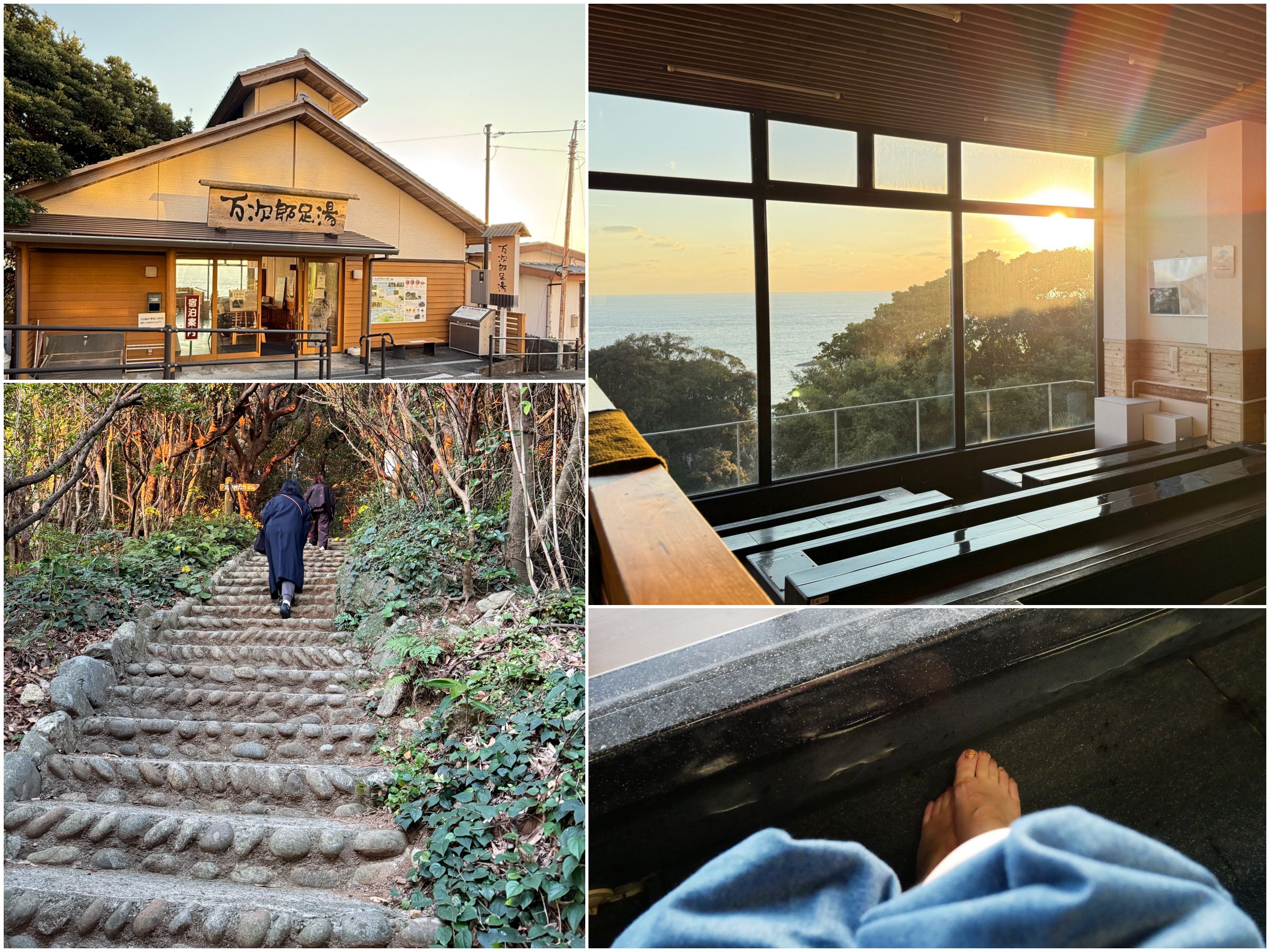 帰りは、下まで降りた自分を恨みつつヒィヒィ言いながら地上まで戻り、足摺岬にある「白山洞門展望 万次郎足湯」へ。眼前に広がる雄大な太平洋と沈んでいく夕陽を見つめながら、崖登りで酷使した足を労りました。