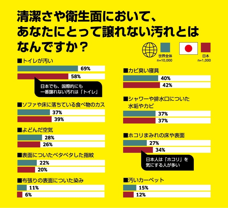 その汚れとは「トイレの汚れ」と「ホコリ」。トイレの汚れについては、世界的にみても「ここだけは譲れない(きれいにしておきたい)」と考える人が多いみたいです。