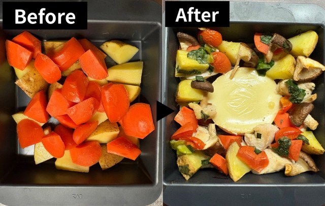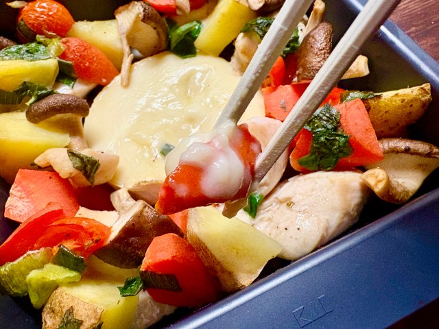 大きな野菜をレンジでチンしてからお肉と他の野菜を足し、中央にカマンベールチーズをのせれば、「チーズフォンデュ風焼き野菜」なんておしゃれなメニューも簡単にできちゃいます。