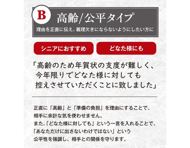 →正直に「高齢」と「準備の負担」を理由にすることで、相手に気を遣わせないとともに、公平性を強調して相手との関係を守ることができます。