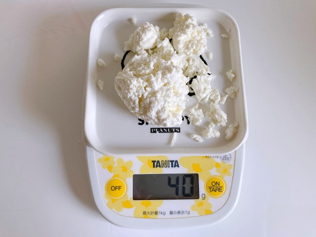 モッツァレラ2袋分のホエーで、約40gのリコッタチーズができました。