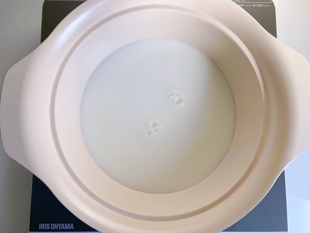 ①ホエーと牛乳を鍋に入れたら、焦らずゆっくりと温める