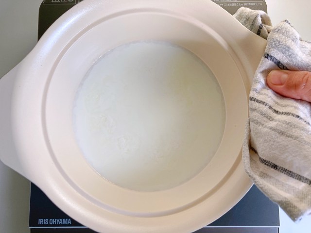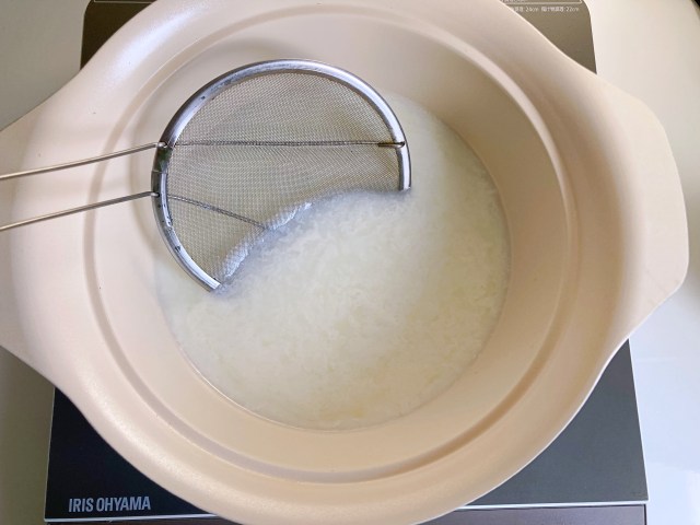目安は 80度くらい。沸騰させてしまうとボソッとした仕上がりになるので、ここは注意ポイントです。