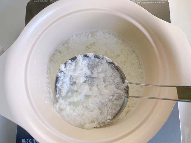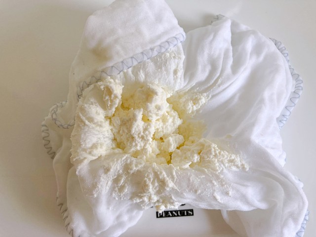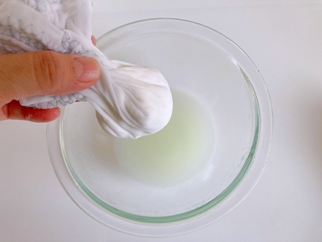 ③チーズが浮いてくるので掬い取りガーゼなどで絞る