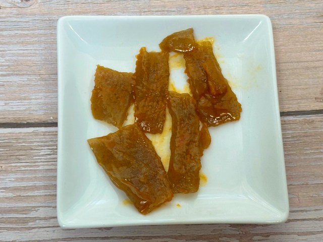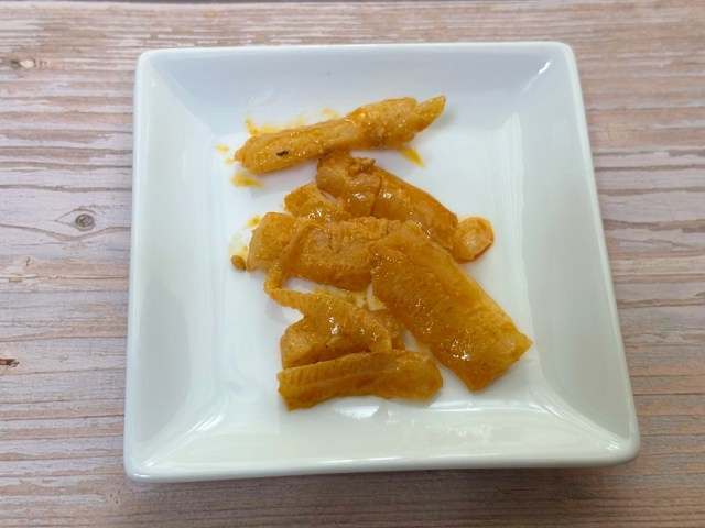 パッケージを開けると、中には小袋が4袋入っていました。そのうちの1袋をお皿に出してみると、出てきたのは薄く長方形にカットされたこんにゃく。といっても、見た目はこんにゃくというよりもメンマのよう……?