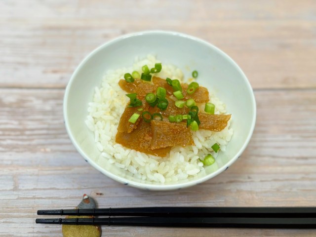 パッケージに「ごはんのお供に」との文字があったので、白いごはんにコリコリ蒟蒻、小ネギを乗せてみましたが、コリコリ蒟蒻の味が濃厚なのでおかず的な感覚で白いごはんにも合いますね~~~!!!
