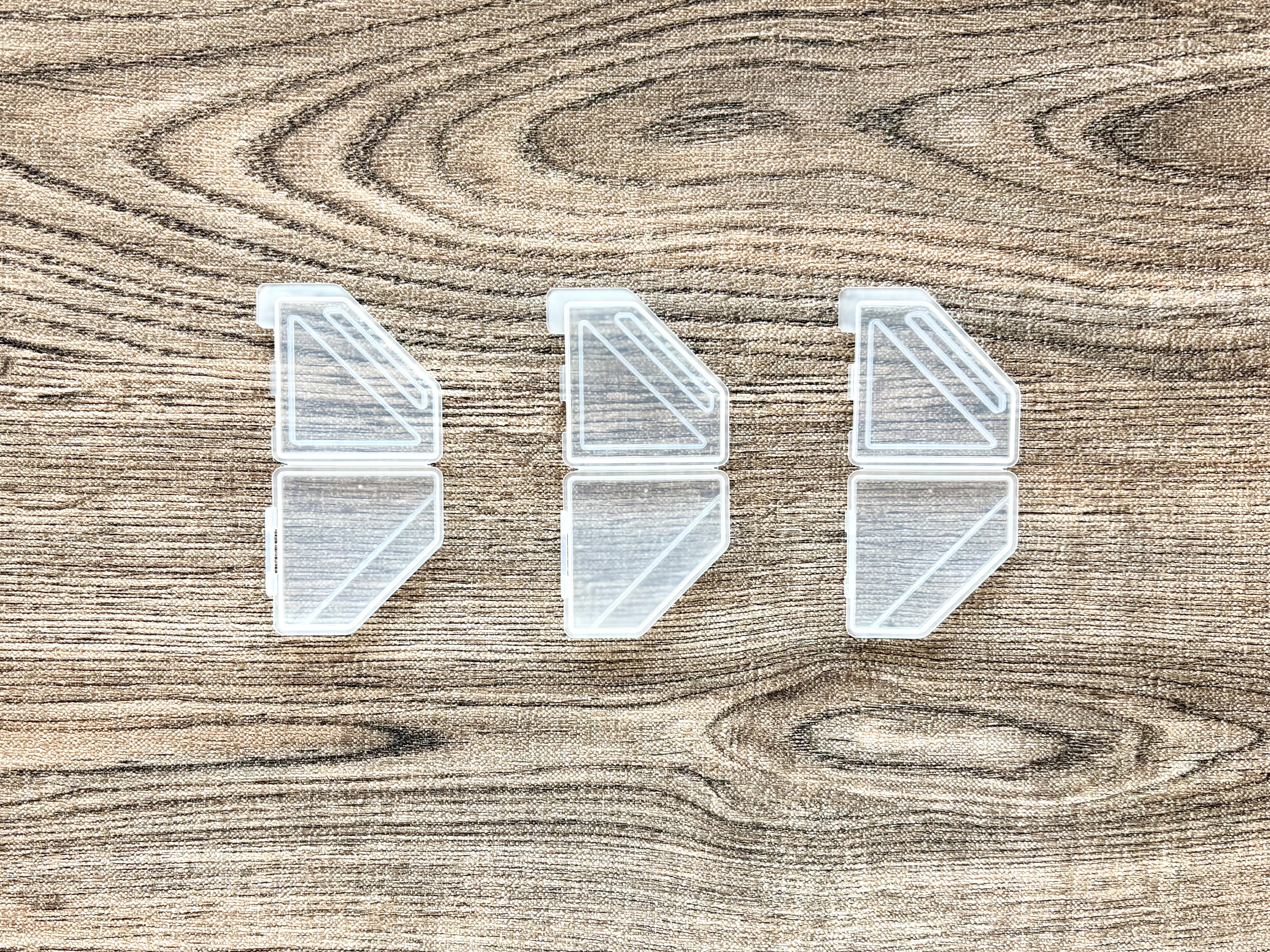 クリップは1袋に3個入りで、すべて三角形のような台形のような独特のフォルム。それを開くとパウチを挟めるのですが、この形こそが最大のポイント!