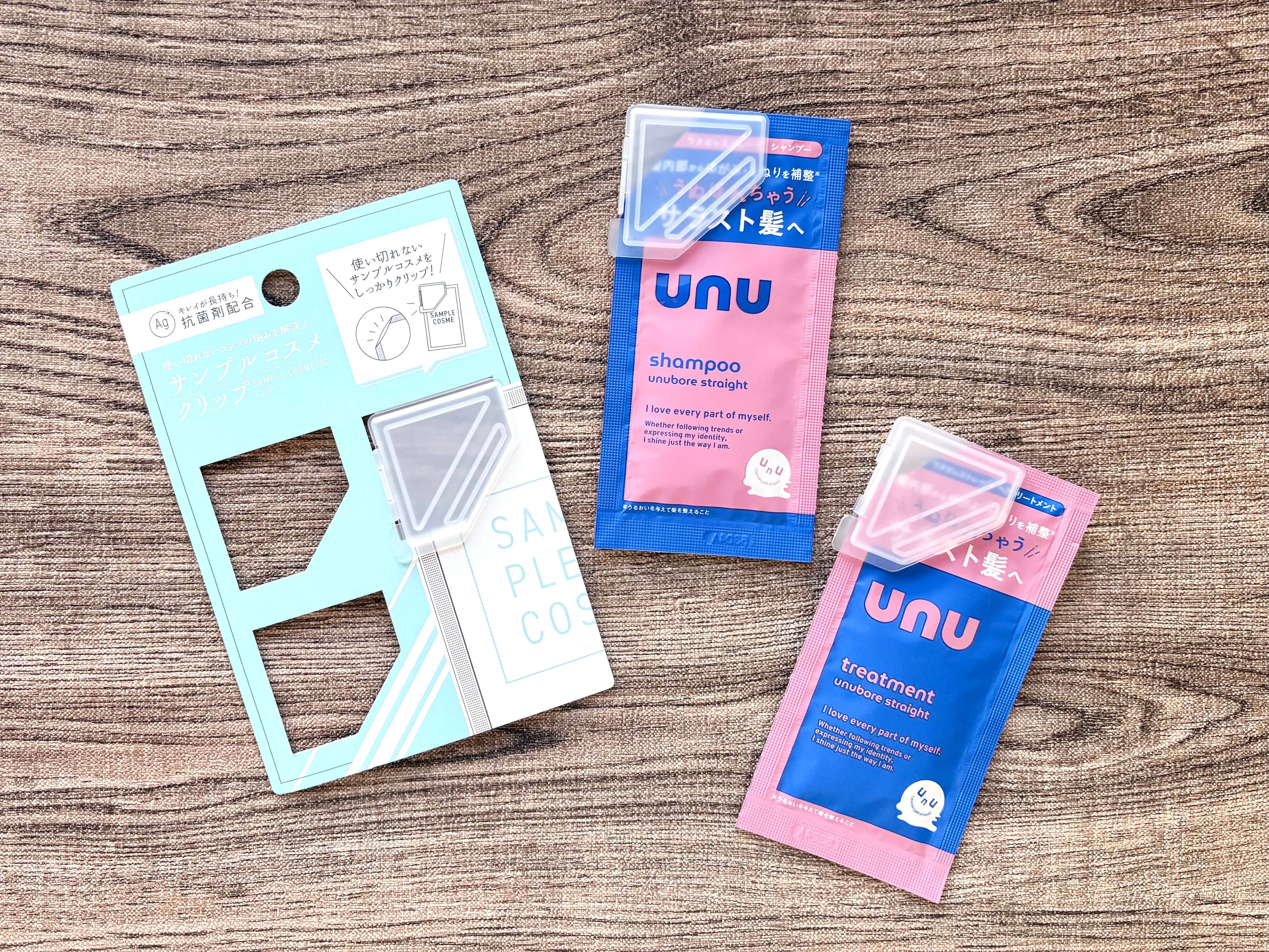 そんなときに活躍してくれるのが「サンプルコスメクリップ」。パウチの開け口をクリップに挟み込めば、まだ残っている中身が流れ出る心配がなくなるんです!