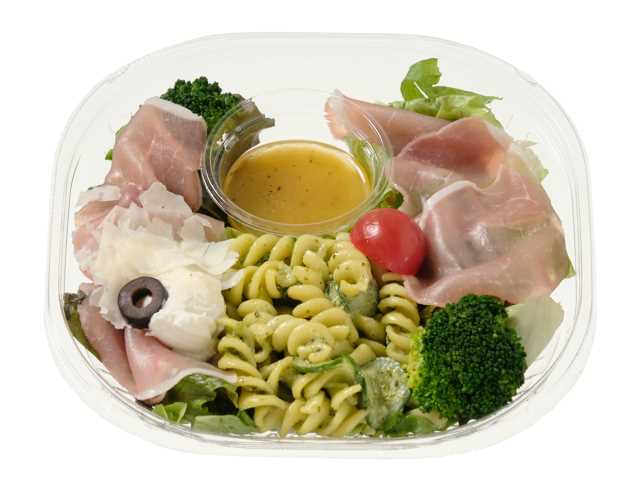生ハムや2種類のチーズにバジルマカロニを組み合わせたサラダ。赤と緑の色合いがクリスマスっぽい!