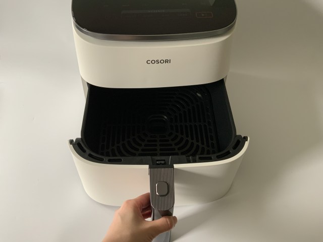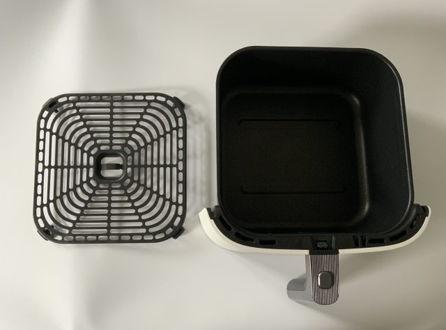 使ってみたのは「COSORI TurboBlaze™ 6.0L ノンフライヤー」。調理バスケットはまるで引き出しみたいな形で、中には網状のプレートが敷かれていました。