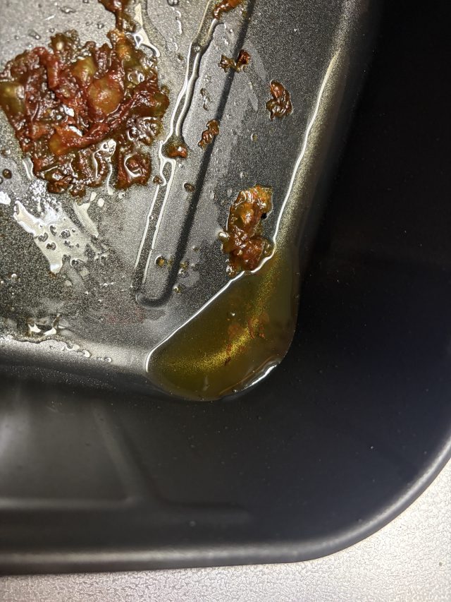 そしてノンフライヤーの最高なところは、食材の油を落としてくれること。たとえば、鶏の手羽元をノンフライした後の調理バスケットを見てみると、大さじ1ぐらいの油がたまっています。これはダイエット中の私には嬉しすぎるポイントです♡
