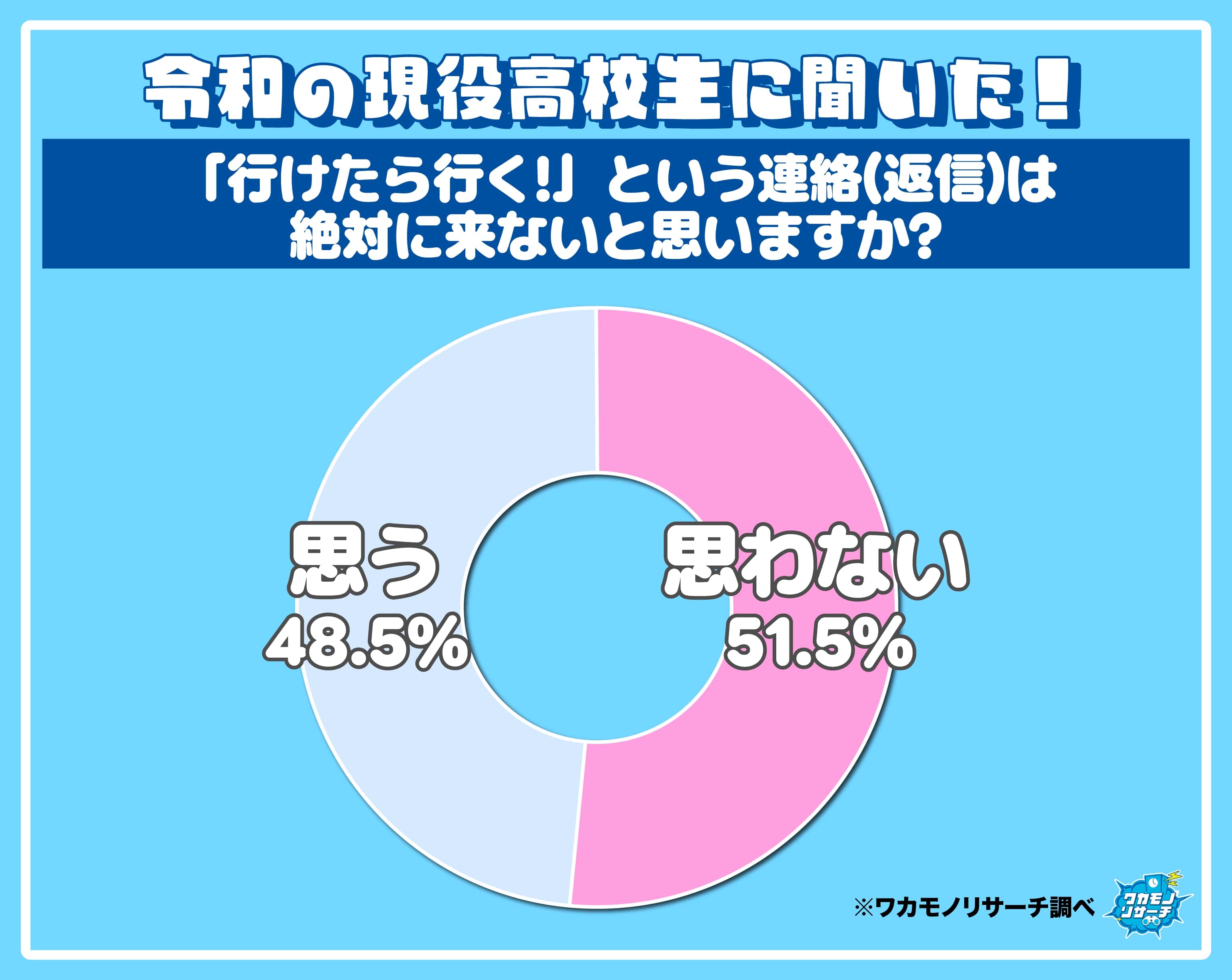 マーケティング情報サイト「ワカモノリサーチ」が全国の現役高校生491名を対象におこなった調査によると……「行けたら行く」の解釈がまっぷたつ!
