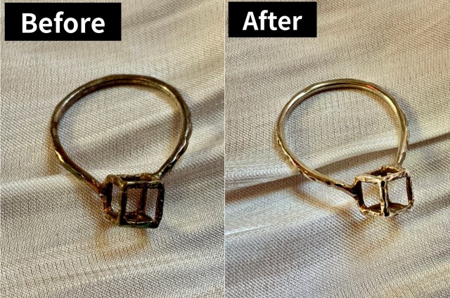 もうひとつ、黒ずんだシルバーの指輪があったので試してみたところ、こちらも見事に黒ずみが落ちて、輝きが戻ってきました。