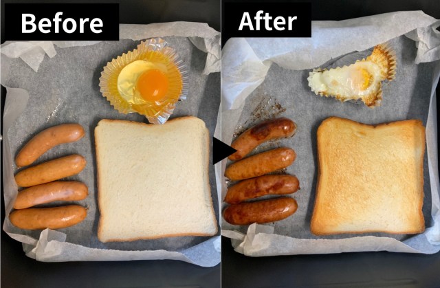 上からの熱が強めなので、両面に焼き色をつけたいときはトーストとウィンナーを途中でひっくり返す必要はあります。また、たまごは火の通りが早かったので、こだわりの焼き加減にしたいなら、たまごだけを途中で取り出すことをオススメします。