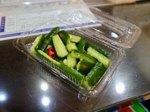 小皿料理は、注文したぶんだけ棚から自分で好きなものを取りに行きます。私はきゅうりの酢の物をチョイス。箸やタレなども、セルフサービスで取りに行くスタイルです。