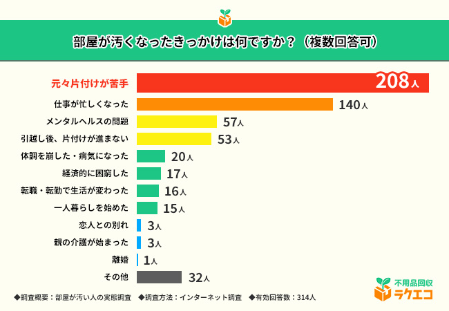 こうしてみると、皆さん部屋が汚いことを自覚しているようだし、その理由もわかっているよう。