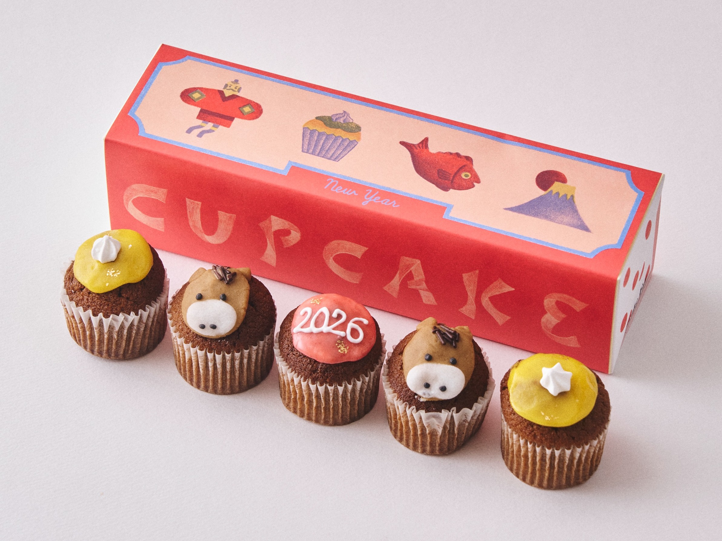 愛くるしいお馬さんのお顔をデコレーションした、紅茶ベースの新春限定カップケーキ。初日の出を思わせるいちごやレモンのアイシングもかわいい3種のアソートです。