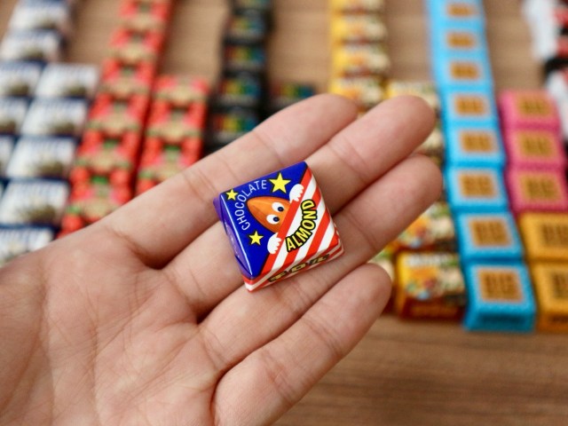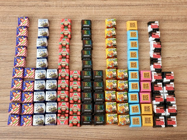テーブルにチロルチョコをドサッと広げ、ちまちまと1粒ずつ並べながら数えてみることにしました。