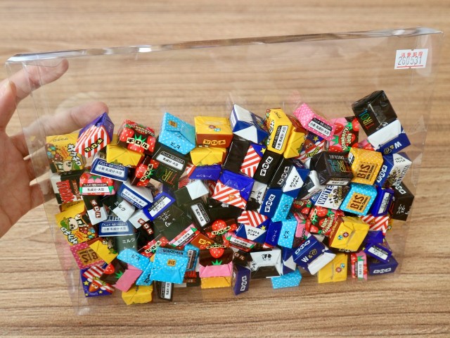 さっそく袋から取り出してみると、透明の長方形のボックスにチロルチョコがどっさり!!