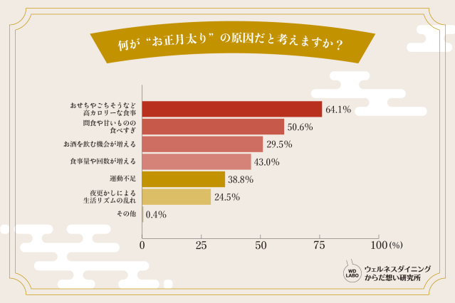 その原因でもっとも多かったのが、「おせちやごちそうなど高カロリーな食事」(64.1%)という回答。次いで、「間食や甘いものの食べすぎ」(50.6%)、「食事量や回数が増える」(43.0%)が続きました。