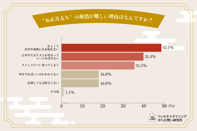 とはいえ、アンケート結果を見ると、「忙しくて食事や運動に気を配れない」「仕事や生活リズムが変わってペースを戻せない」といった理由から、お正月太りの解消を難しく感じる人も多いようです。