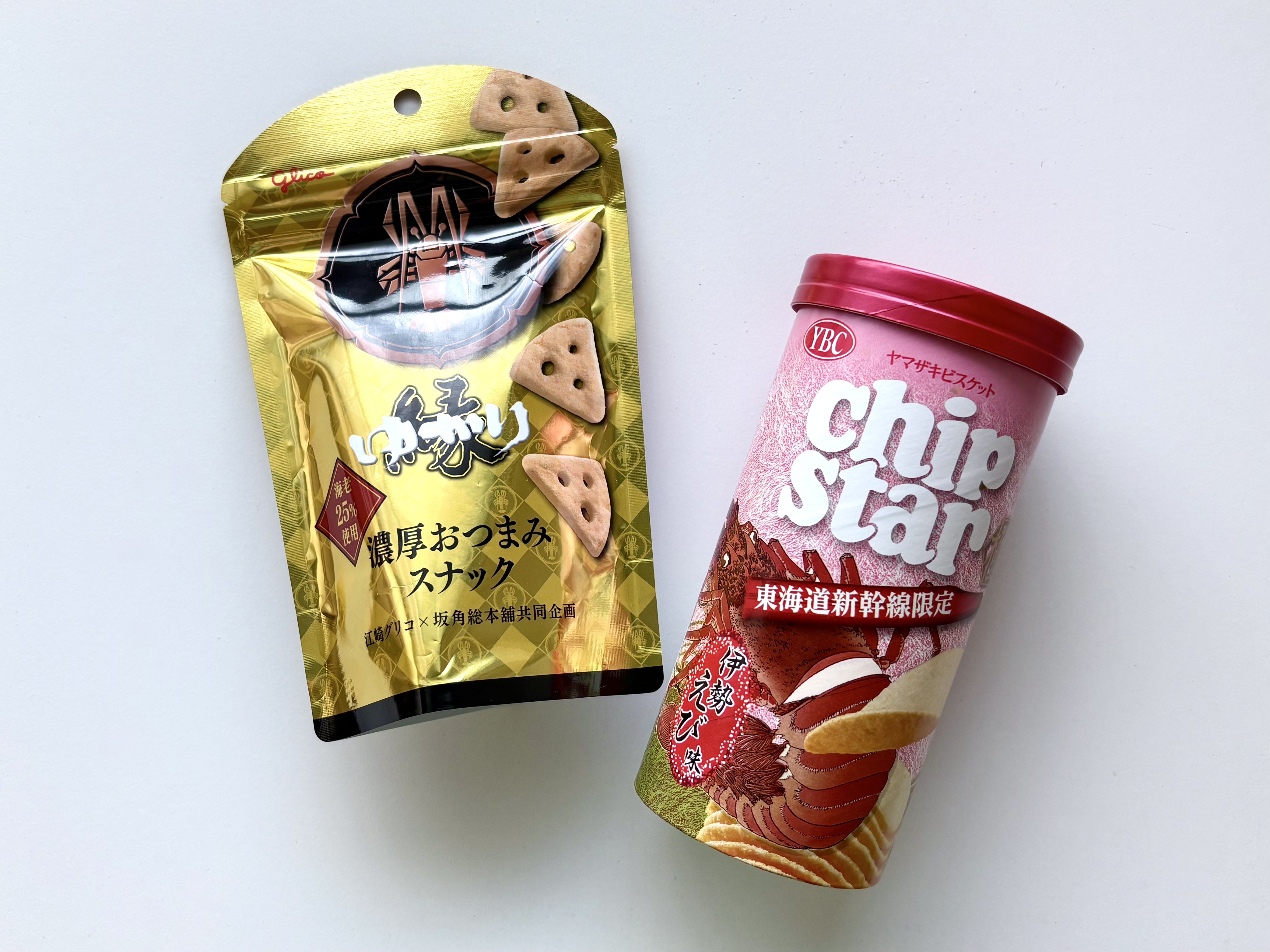 東海道新幹線に乗るなら、必ずこれを買わなきゃ!と思っているほどお気に入りの「ゆかり 濃厚おつまみスナック」と「チップスター極 伊勢えび味」。
