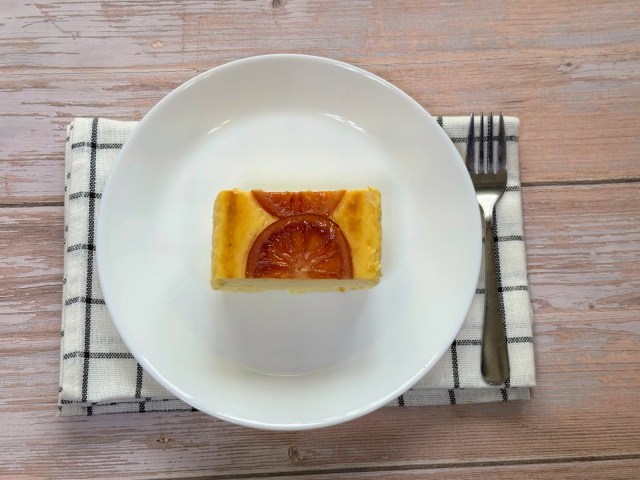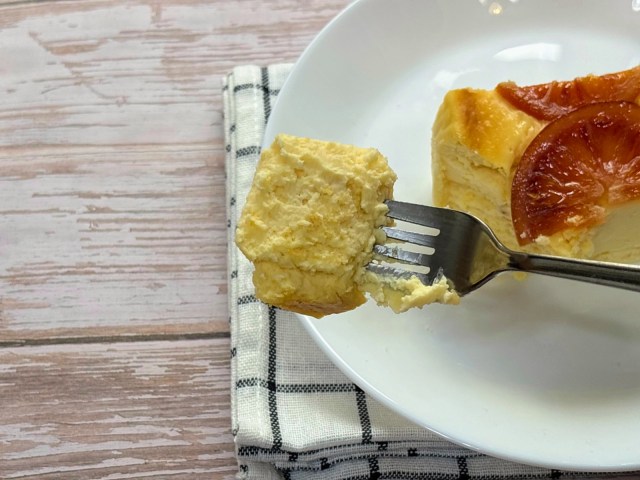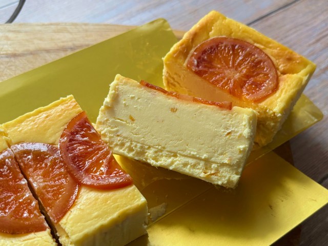 ほんのりと焦げ目がついたチーズケーキの上には鮮やかな色のブラッドオレンジが乗っていて、まず見た目からして美しい……!