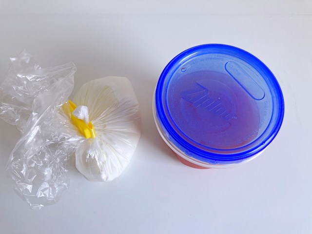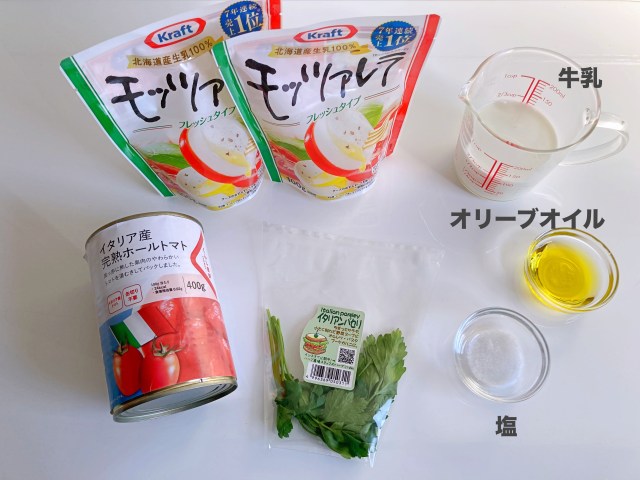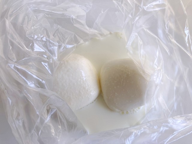 まずはモッツァレラを牛乳に漬けて冷蔵庫でふた晩、休ませますよ〜。こうすることによってチーズの隙間に牛乳が入り込み、しっとり&よりミルキーな味わいに変化するんだそう。