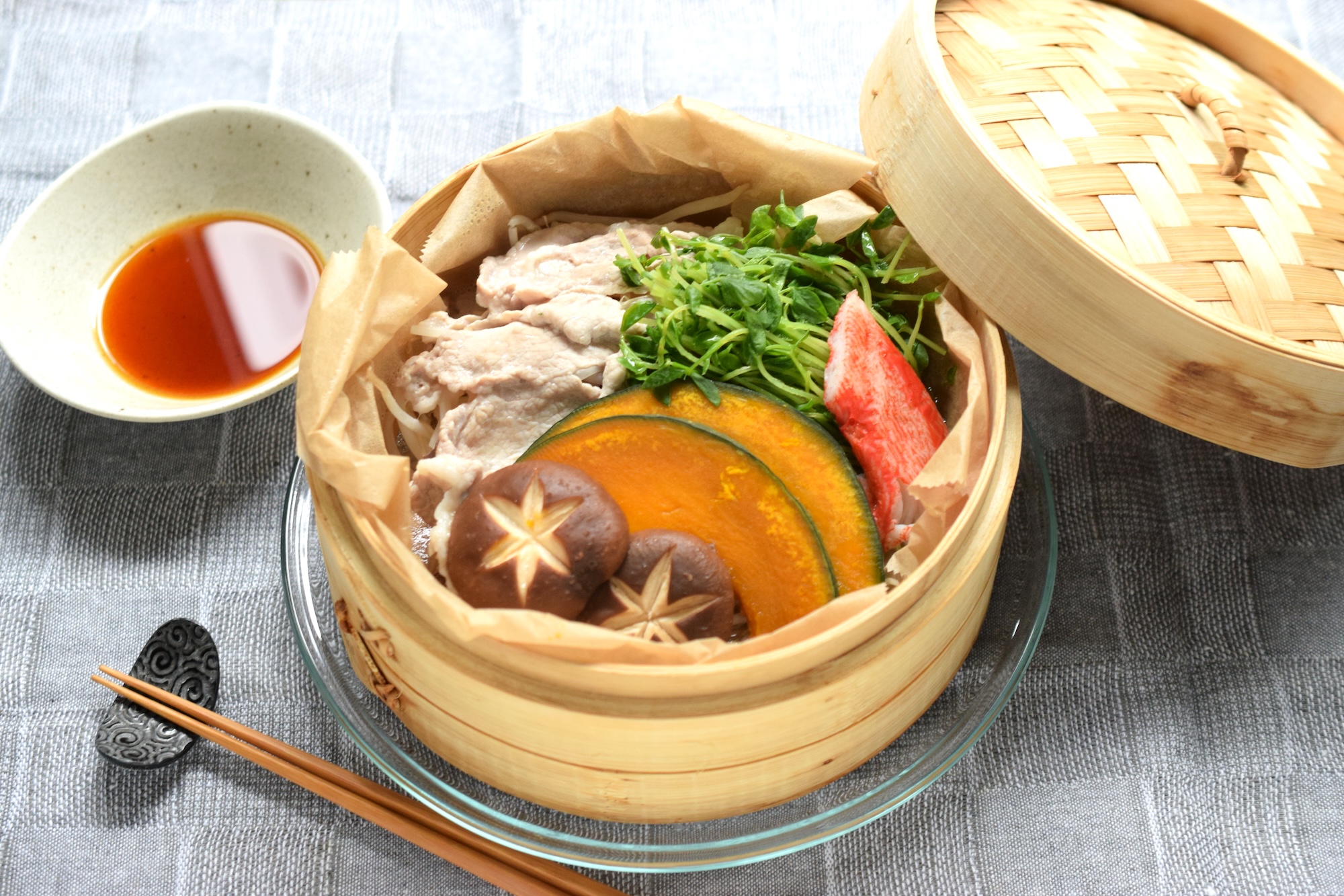 蒸すことで余分な脂質をカット+たんぱく質がしっかり摂れる鍋。せいろにもやし・豚肉・しいたけ・豆苗・カボチャをのせて蒸したら、手製のポン酢しょうゆをつけていただきます。おすすめちょい足し食材はカニカマ。