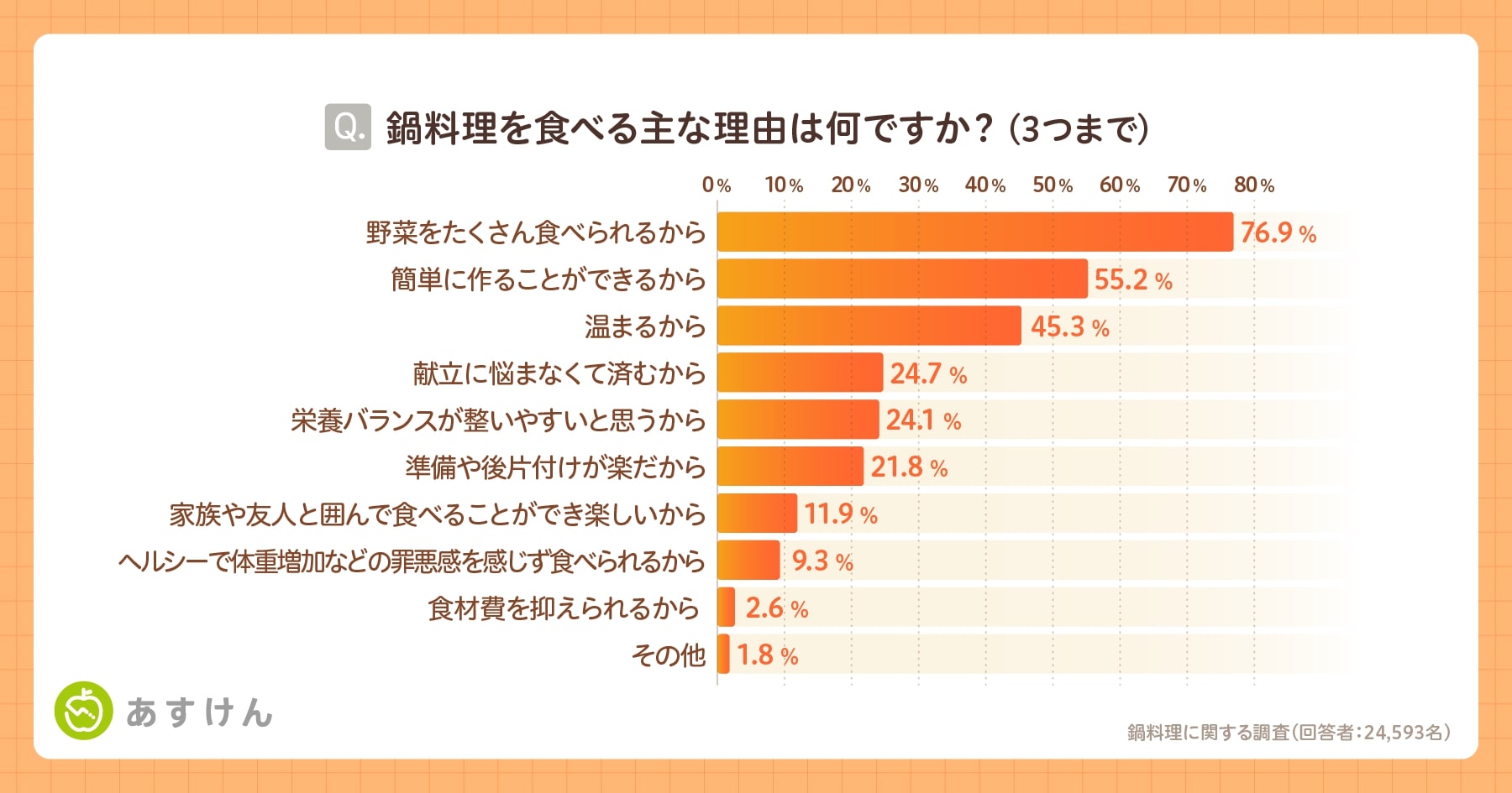 あすけんユーザー2万5471名を対象におこなった調査によると、約半数の人が「週に1回以上は鍋料理を食べる」と回答していたみたい。鍋を食べ始める時期は「11月頃から」がもっとも多く、「ほぼ1年中食べる」という回答も17%にのぼっています。ちなみに、鍋料理を食べる理由TOP3はこちらで~す!