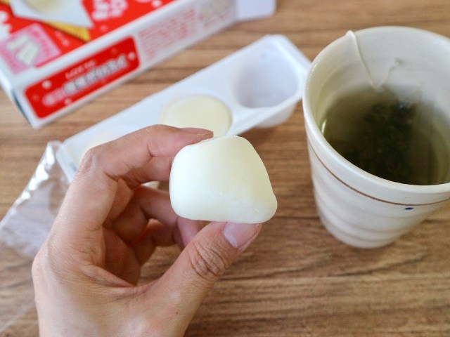 さぁ、暖かい部屋で温かいお茶と一緒にいただきます。ちいさいので、ひとくちでパクッ。