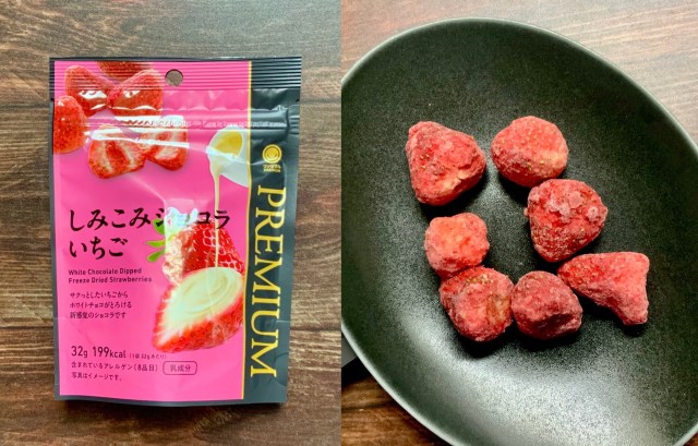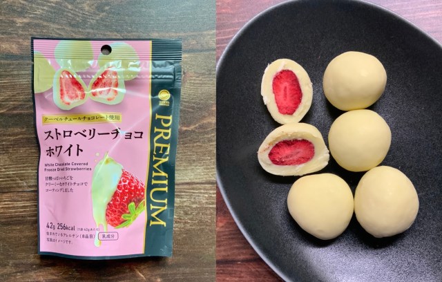 見た目はドライストロベリーですが、食感はチョコレート! ホワイトチョコの甘さといちごの風味が一体となった、なんとも不思議な感覚が味わえます。