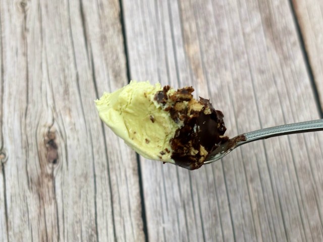 スプーンですくってみると、チョコレートの下には緑色のピスタチオアイスが入っているのがわかります。