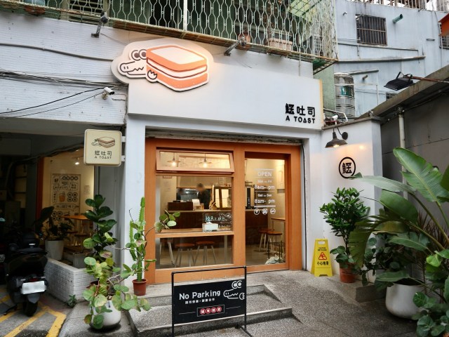 訪れたのは、台北MRT公館駅近くにある朝食ブランチ店「鰐吐司 A Toast」。このエリアはすぐ近くに台湾大学があることから、学生街として知られています。トーストサンドからワニくんがひょっこり顔をのぞかせる可愛らしい看板が目印です。