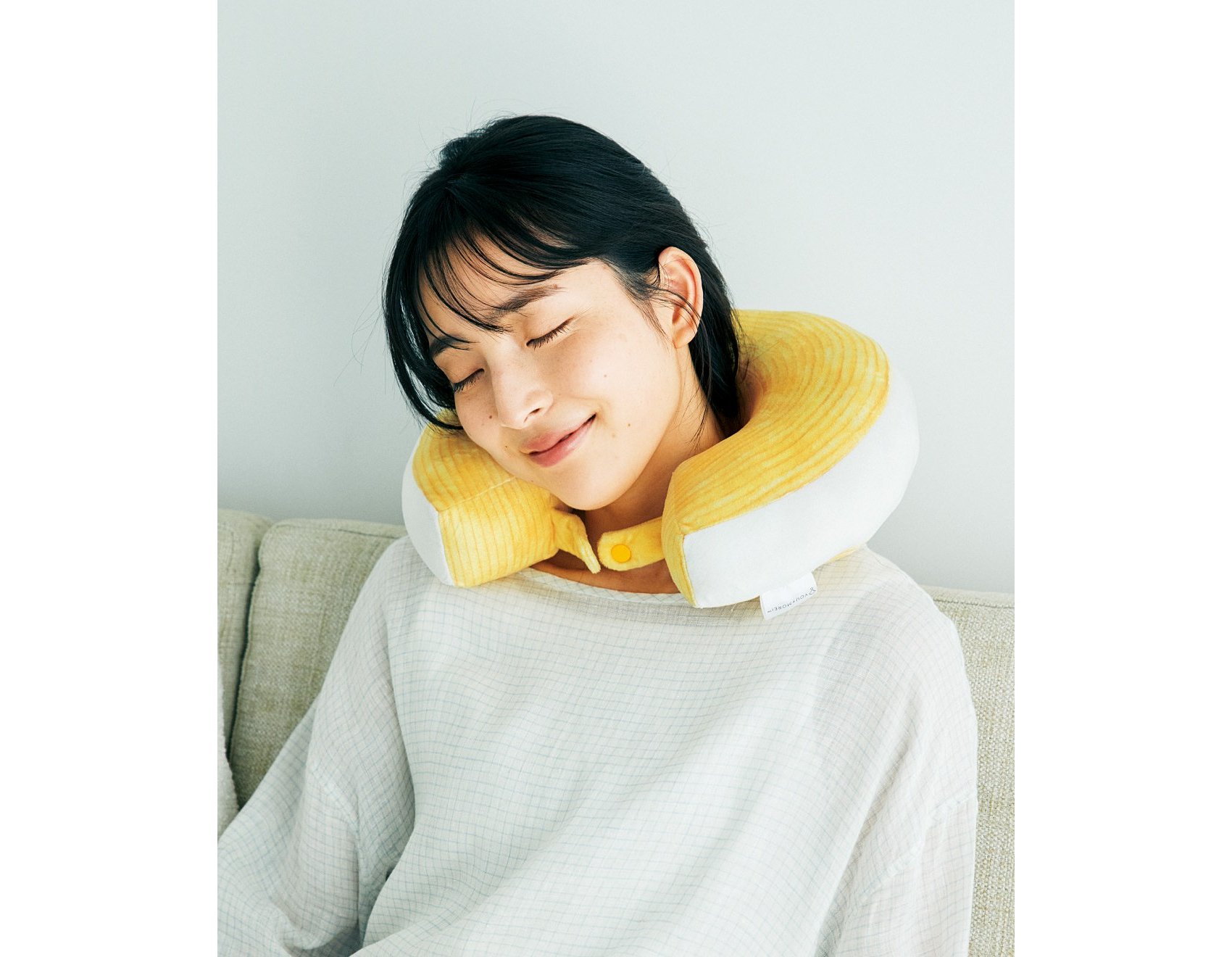 首に装着すると安定感もあって、乗り物での移動中はもちろん、おうちでのくつろぎタイムにもぴったりとのこと。これでお昼寝すればバウムクーヘンの夢が見られるかも……?