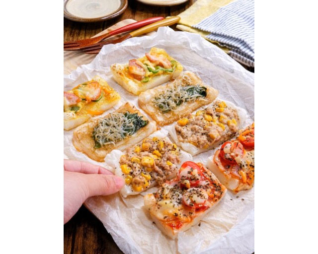 厚みを半分にした切り餅をピザ生地に見立て、ツナマヨコーンやしらす大葉などさまざまな味を楽しめます。