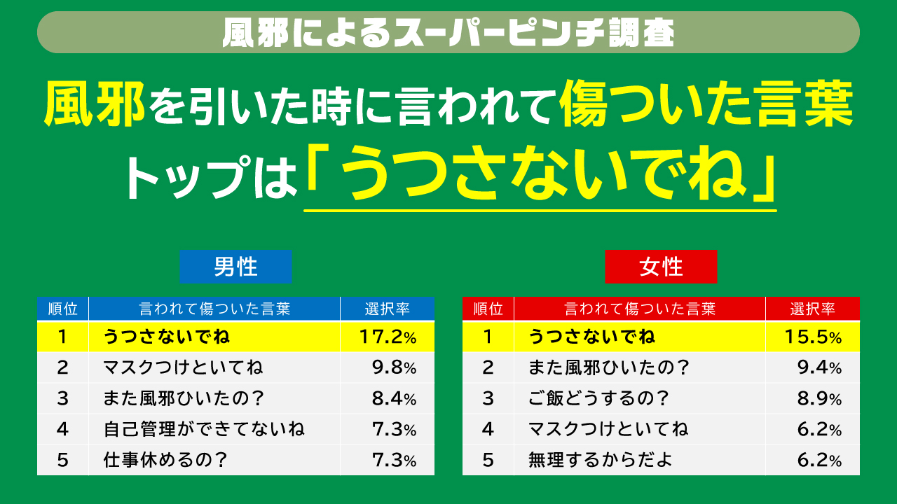 ある調査によると、風邪のときに言われて傷ついた言葉1位は「うつさないでね」でした。たしかに、風邪で弱っているときにそんな言葉かけられたら、もっと弱ってしまいそうなんですケド(涙)。