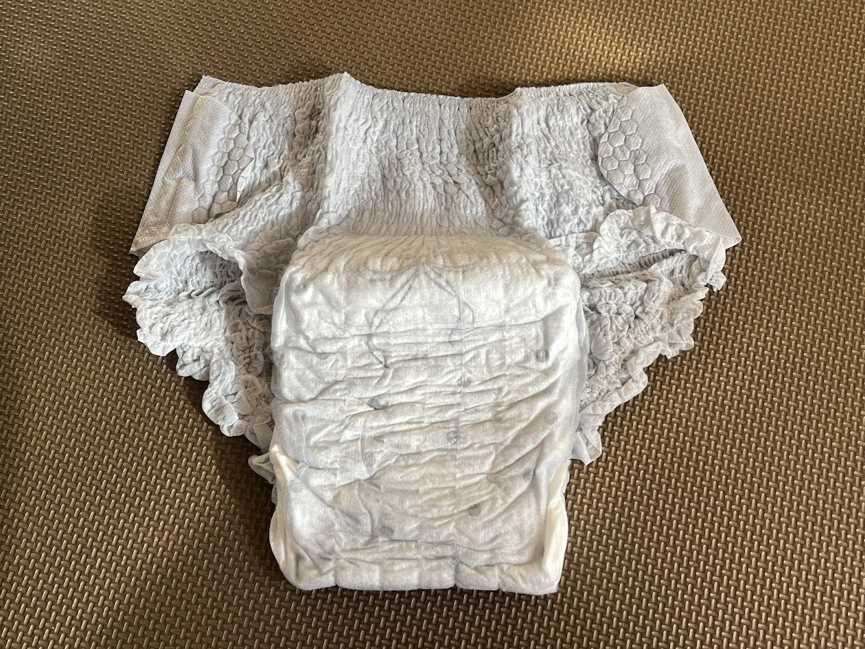 ウエスト部分がゴムになっているほか、全体にギャザーが入っているため、腰まわりからおしり全体にかけてほどよくフィット。最初に装着したとき、どれくらいのサイズにすればいいかわからなくて「ゆるめ」にしたものの、ゆるゆるではなく「ちゃんとフィットしている感覚」がありました。