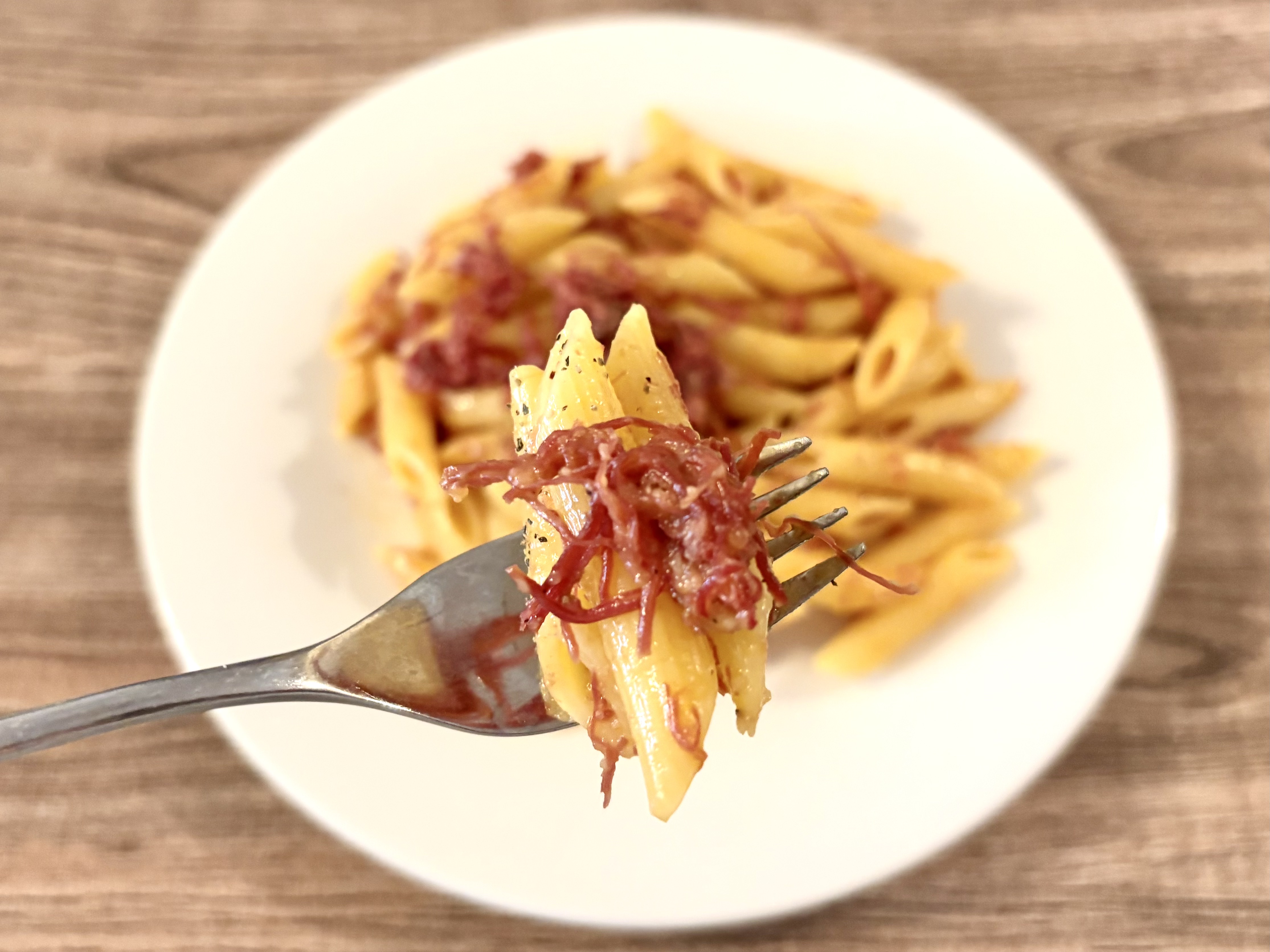 もう、見るからにおいしそうじゃないですか。実は私、より濃厚なおいしさが楽しめるから生クリームなしで作るカルボナーラが大好き。なので、こちらも味への期待が高まります。