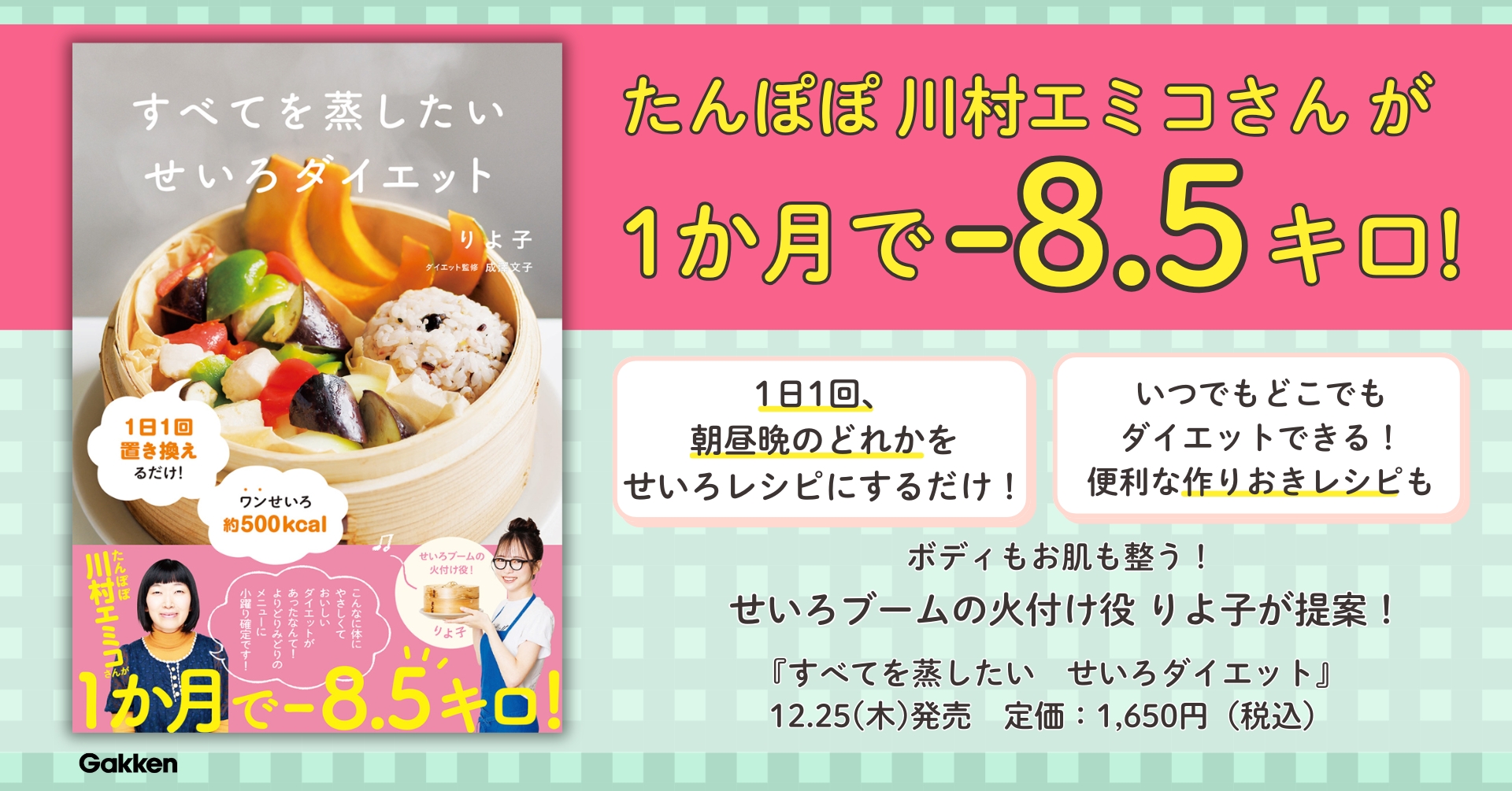 カラダを温めながらダイエットできる、せいろダイエットのマニュアル本『せいろダイエットレシピ 食事制限なし! 1食置きかえるだけで1か月で4kgやせ!』。栄養士免許をもつ著者が考案した健康的+食事制限なしで無理なく続けられるメニューがラインナップされているみたい。