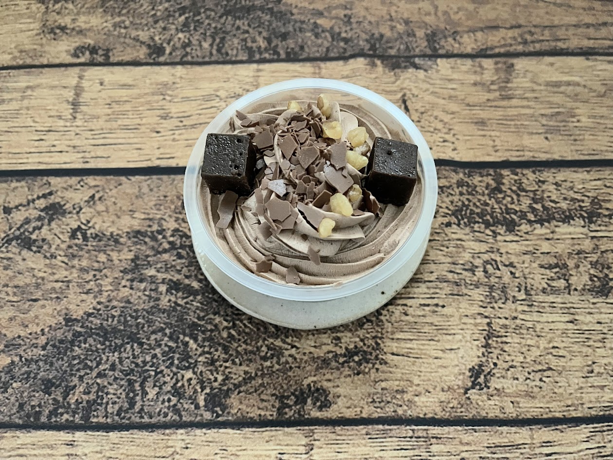 ココアスポンジとチョコムースにチョコホイップを重ね、くるみとガトーショコラ生地をトッピングしたパフェ。